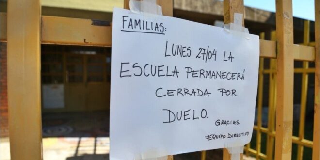 La escuela estaba cerrada con candado este lunes. Un cartel en la puerta explicaba que era por duelo y que se retomarán las actividades mañana martes.