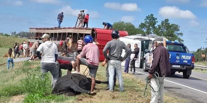 Además de la intervención policial para garantizar seguridad, también trabajó en el lugar personal comunal y vecinos que se acercaron para colaborar. Tras el vuelco, los animales quedaron atrapados y fue necesario cortar parte de la estructura metálica de la jaula para liberarlos y luego alojarlos en un campo cercano hasta que sean retirados.