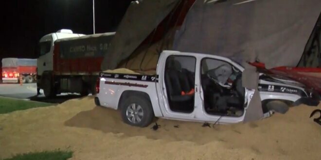 n grave siniestro vial se registró este lunes a la tarde en la región sin dejar heridos graves a pesar de la magnitud del accidente. Un camión con acoplado cargado con soja volcó sobre una camioneta con tres ocupantes.