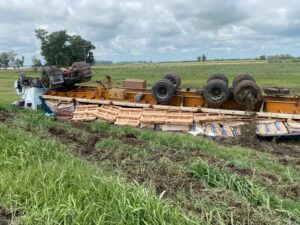 El siniestro se produjo en la Ruta Nacional 34 minutos después de las 11 de este miércoles. Bomberos Voluntarios de Sunchales acudieron al lugar para prestar colaboración. Ruta Nacional 34 km 272.5, camión accidentado en Tacural.